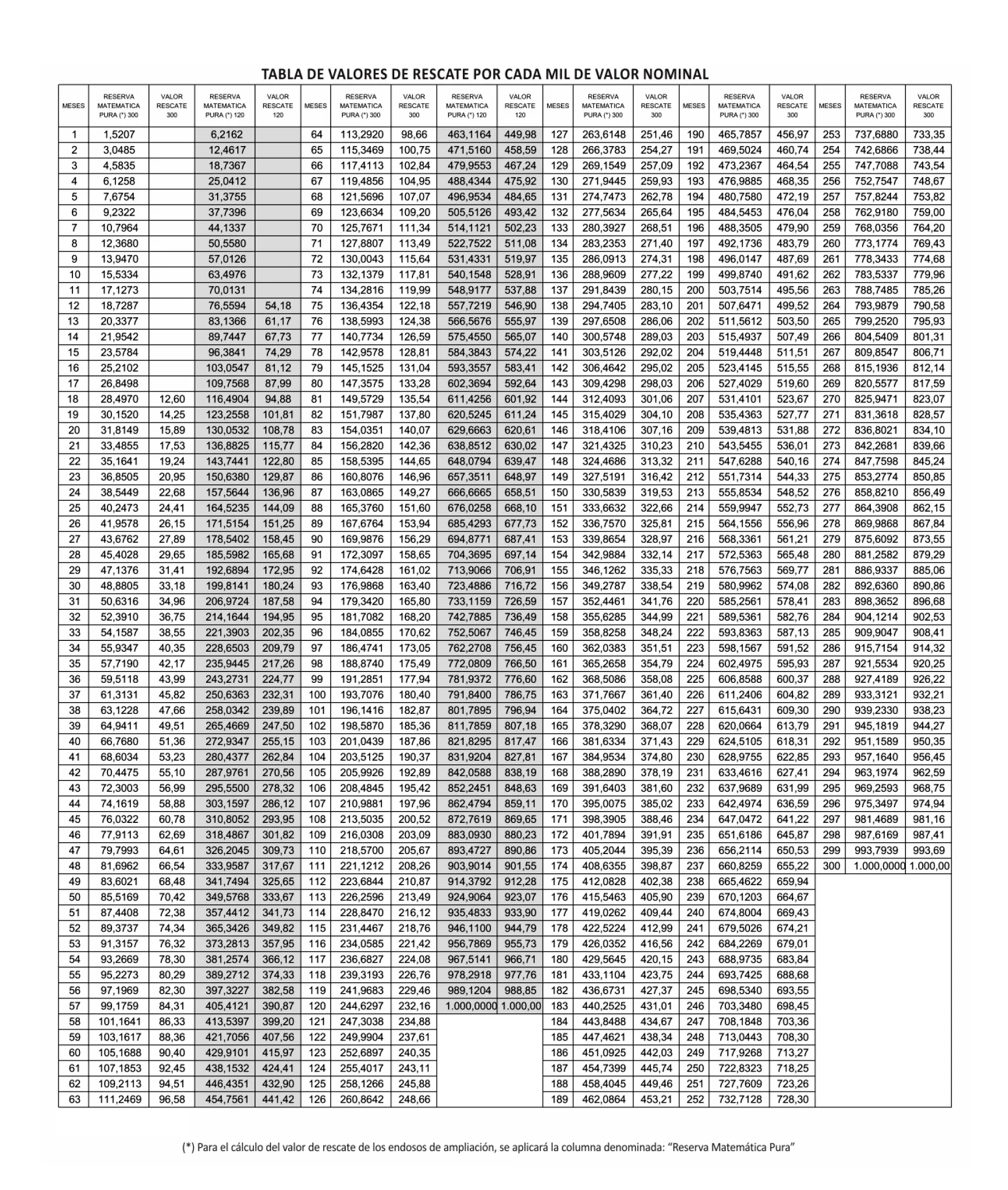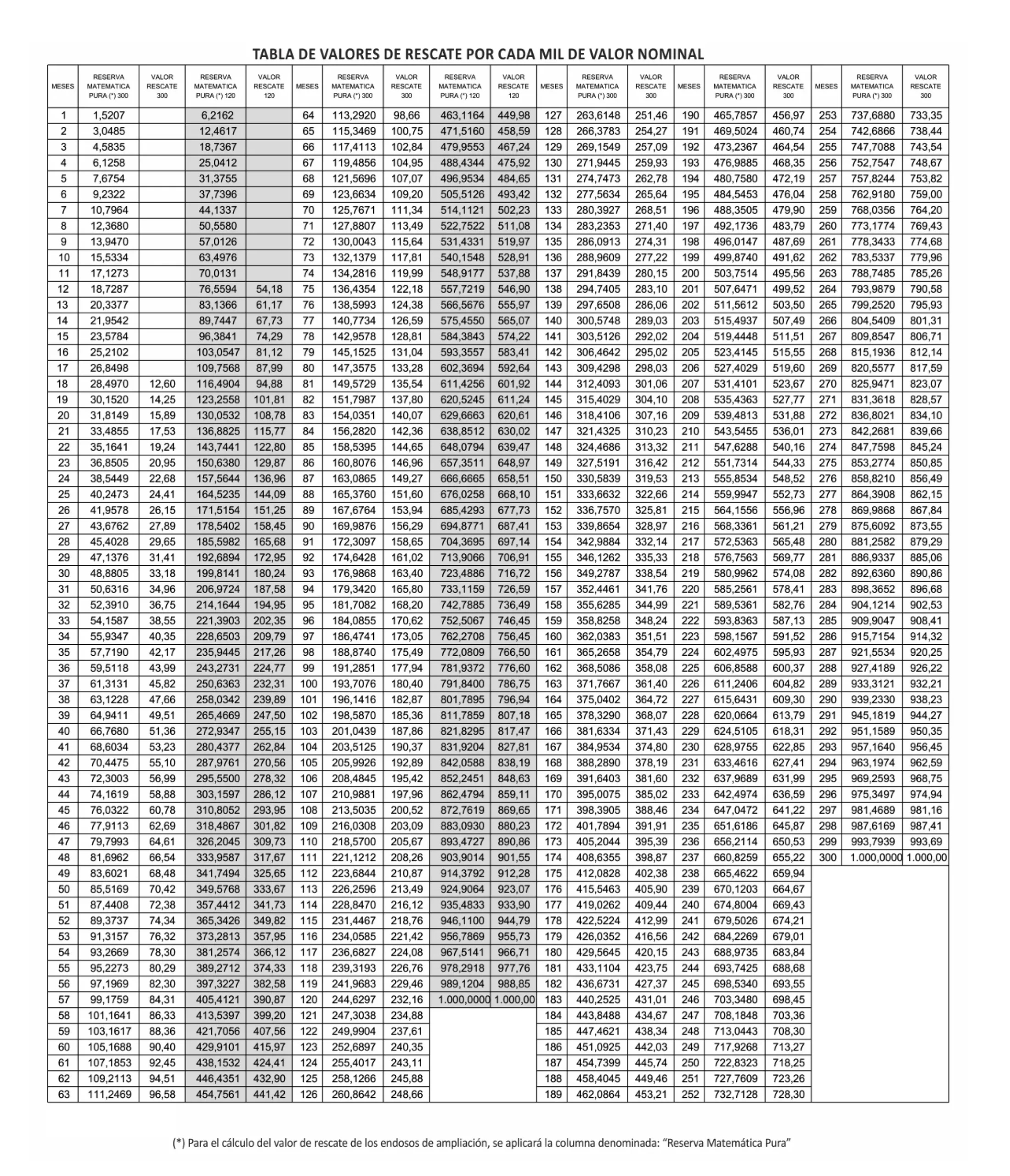 Se transcribirán a continuación: TABLA DE VALORES DE RESCATE POR CADA MIL DE VALOR NOMINAL – PLAN 120 y 300 MESES.