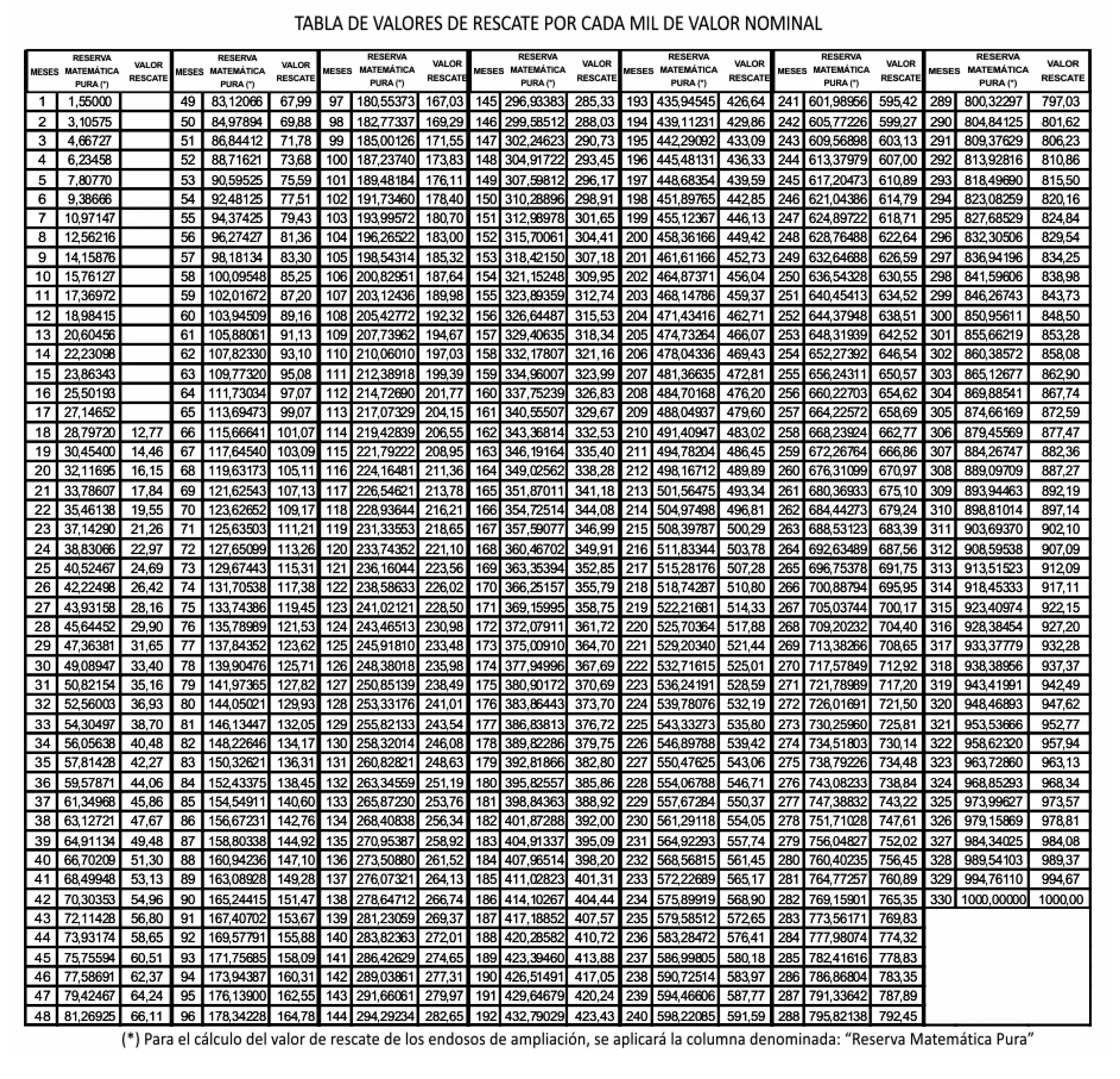 La Sociedad abonará dichos importes dentro de los 30 (treinta) días de su pedido. El haber que le corresponde al Titular se determinará en base a la Tabla de Valores de Rescate que figura en el Cuadro de Valores inserto al dorso del Título, conforme el siguiente procedimiento: se toma la cantidad de Cuotas Comerciales pagadas y se ingresa a la tabla por la columna “meses” en el renglón correspondiente a esa cantidad, se multiplica el Valor Nominal del Título por el guarismo de la columna “Reserva Matemática Pura” y se lo divide por 1.000 (mil).
